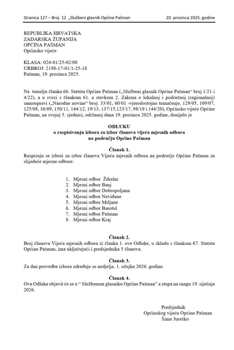 NovostiIzbori za članove mjesnih odbora5 siječnja, 2026 Obavijest o kandidaturamaPreuzmi Objava biračima Općine PašmanPreuzmi Broj upisanih birača po mjesnim odborimaPreuzmi Uputa IPreuzmi Uputa 2Preuzmi Obrazac OVM 1Preuzmi Obrazac OVM 2Preuzmi Obrazac OVM 3Preuzmi Izbori za članove mjesnih odboraNatječaj za davanje u zakup poslovnog prostora u vlasništvu Općine PašmanObavijest o I. ponovnoj javnoj raspravi o prijedlogu UPU Kablin